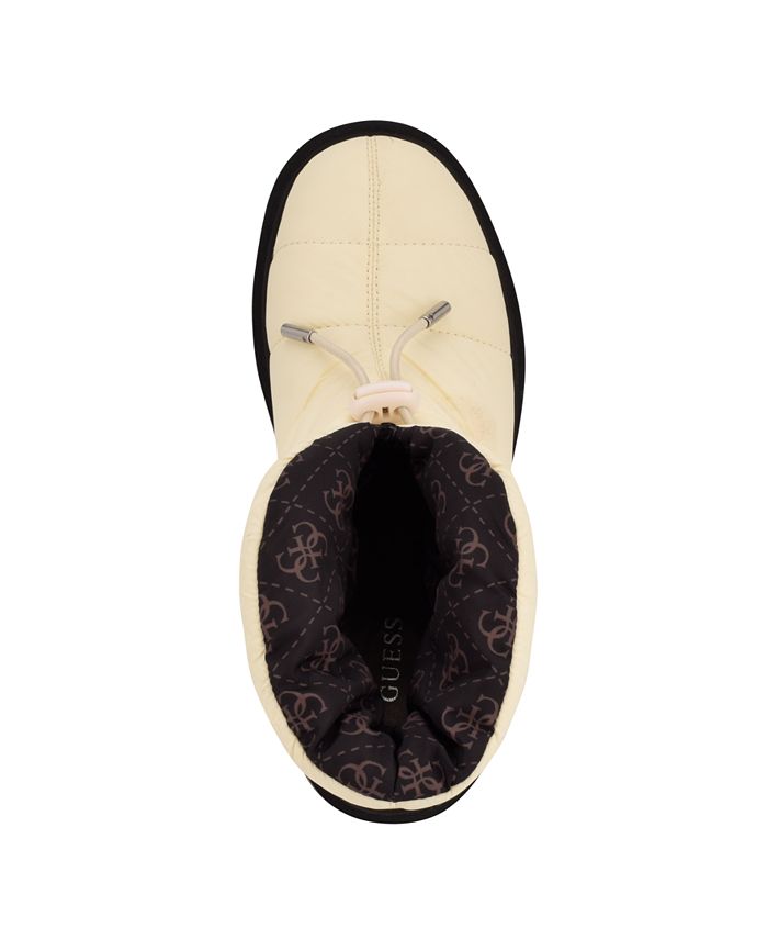 The Leeda fashion boot from GUESS features a puffer upper with an elastic toggle detail and logo trim collar.